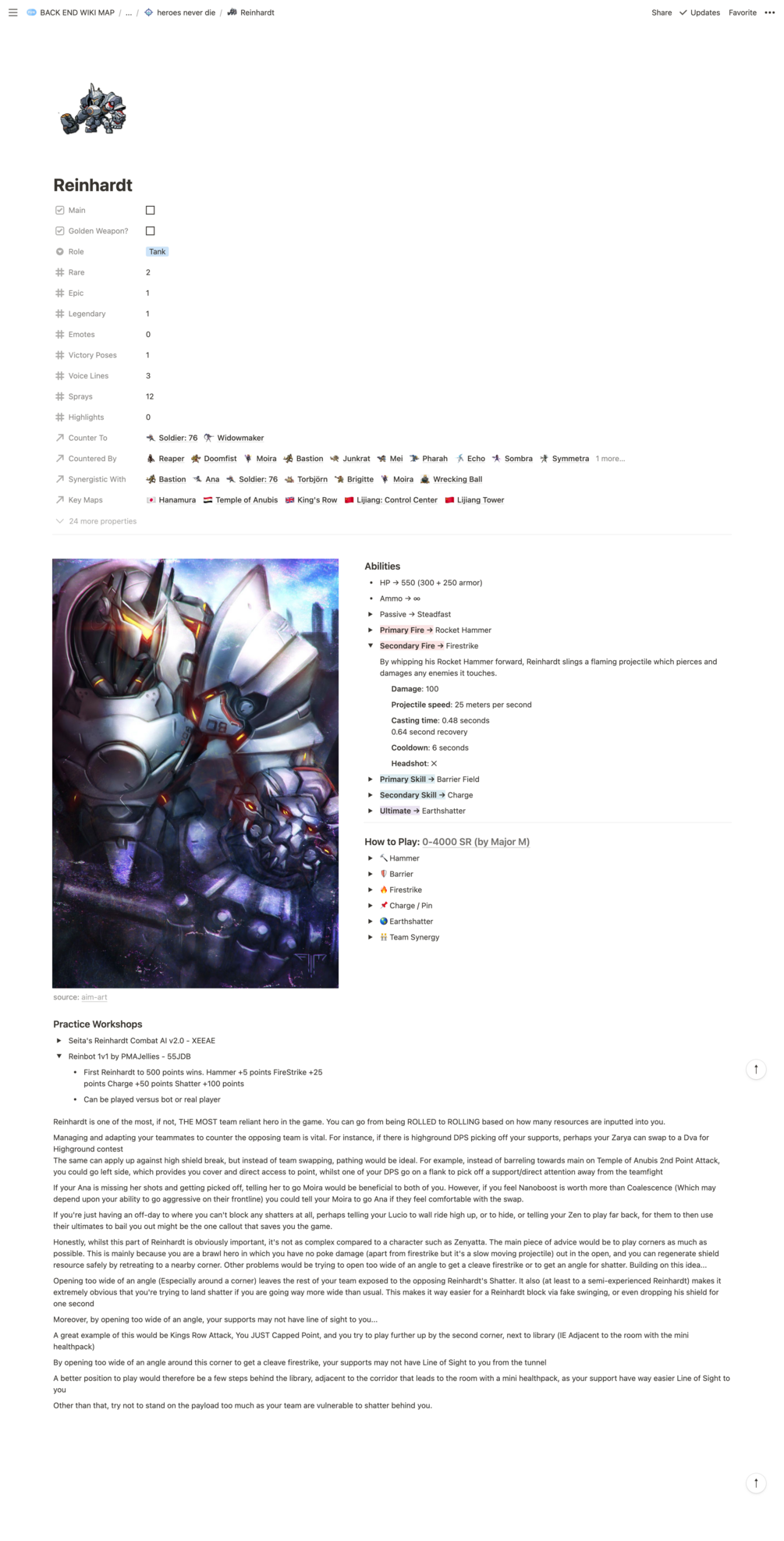 - Heroes database → All current heroes in Overwatch 1, with stats for each of their moves, as well as links to practice workshops and tips for playing.